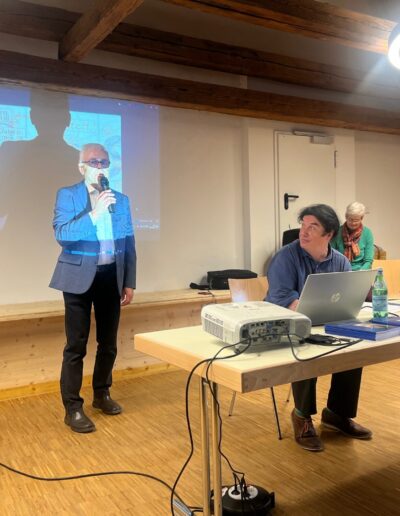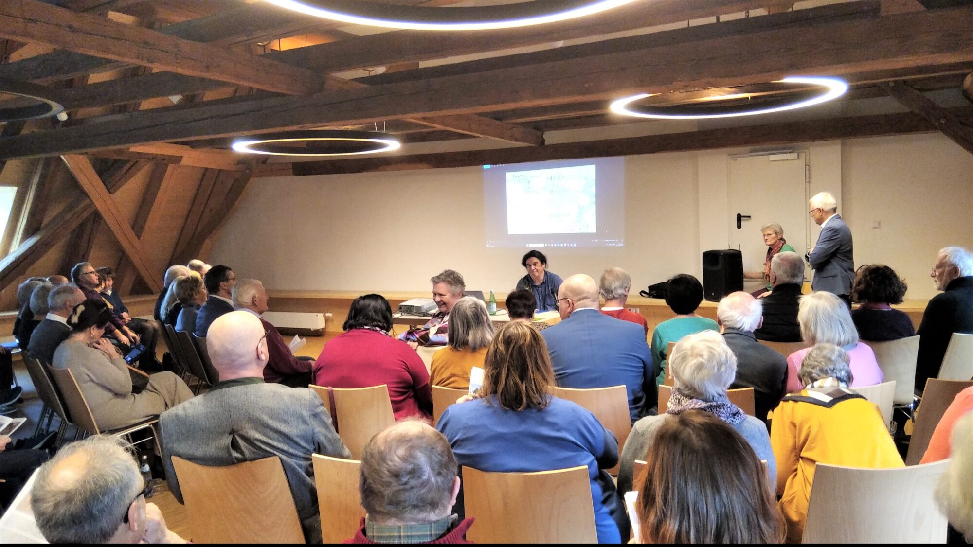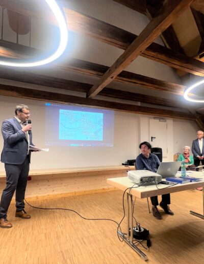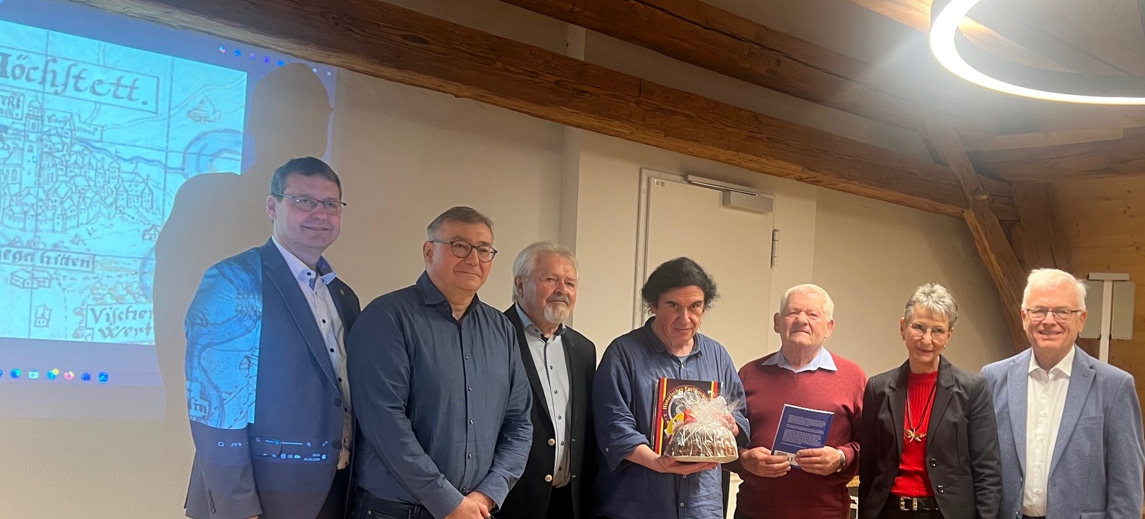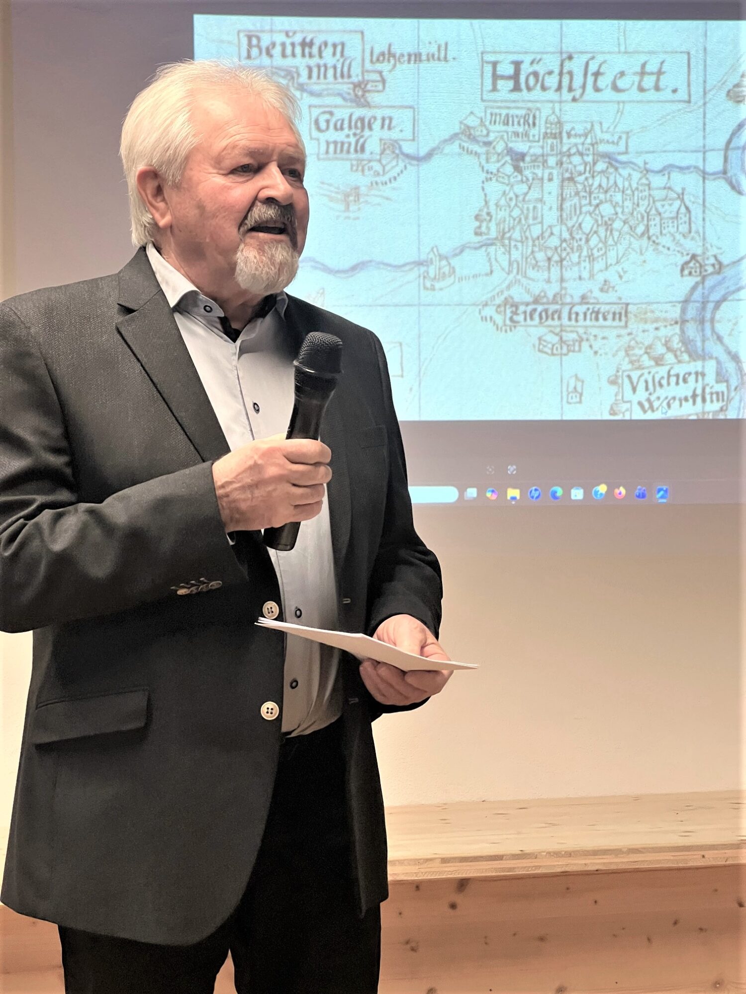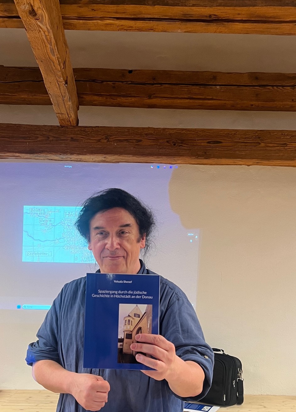 Autor Yehuda Shenef verwies in seiner Einführung zunächst auf „Josel von Höchstädt“, jenem rabbinischen Gelherten und Kommentator aus dem 15. Jahrhundert, der gute 600 Jahre vor unserer Zeit, nämlich im Jahre 1430 in Höchstädt geboren wurde und gegen Ende des Jahrhunderts in seinem talmudischen Kommentarband auch viele Details aus seinem Leben schildert und dabei auch in zwei Passagen seinen Geburtsort Höchstädt an der Donau (damals hebräisch notiert als: HoSchtet am Fluss Donai) erwähnte. Shenef dankte sodann dem Ehepaar Scherer-Veh, für die herzliche Gastfreundschaft im vergangenen Jahr die ihm bei seinem Recherchen geholfen hätten, die bald dreihundertjährige Abstinenz einer jüdischen Gemeinde vor Ort zu überbrücken. Er dankte auch Herrn Kapfer und inbesondere Frau Dr. Invild Richardsen vom Netzwerk-Verein, da letztere ihn erst dazu „verleitete“, aus seinen eher nebenbei gewonnenen Erkenntnissen zur Geschichte der Juden in Höchstädt einen Bericht, bzw. einen „Spaziergang“ für den „Netzwerk-Verein“ und für die „Bayerische Landeszentrale für politische Bildung in Bayern“ (BLZ) zu verfassen, was letztere in Kürze online stellen wird. Als Buch erschien sein Werk bereits im Herbst 2025. Schließlich dankte Yehuda Shenef auch noch seinem Freund und Mitglied des JHVA, Herrn Dr. Christian Kreikle, seines Zeichens seit vielen Jahren tätig als Lehrer in Höchstädt und Herrn Emil Veh, als Bewohner der früheren „Judenschul“ am Judenberg in Höchstädt, der im letzten Jahr Shenef Zutritt zum Haus gewährte und bereitwillig alle Fragen beantwortete.