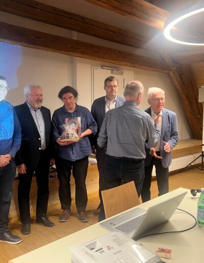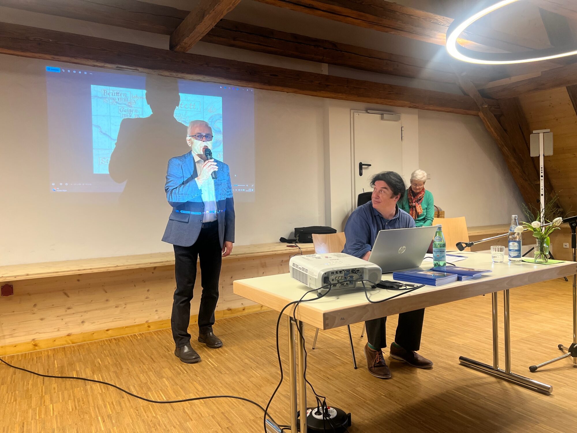 Aus dem interessierten Publikum gab es dann noch eine Reihe von fachkundigen Fragen an den Autor, schließlich auch Buchkäufe und Autogrammwünsche. Die gut sechzig Besucher waren wie Veranstalter und Bürgermeister offenkundig zufrieden mit der gut hundertminütigen Veranstaltung, die mit Präsenten und Pressefotos zu Ende ging.“
